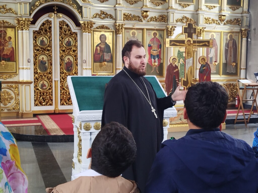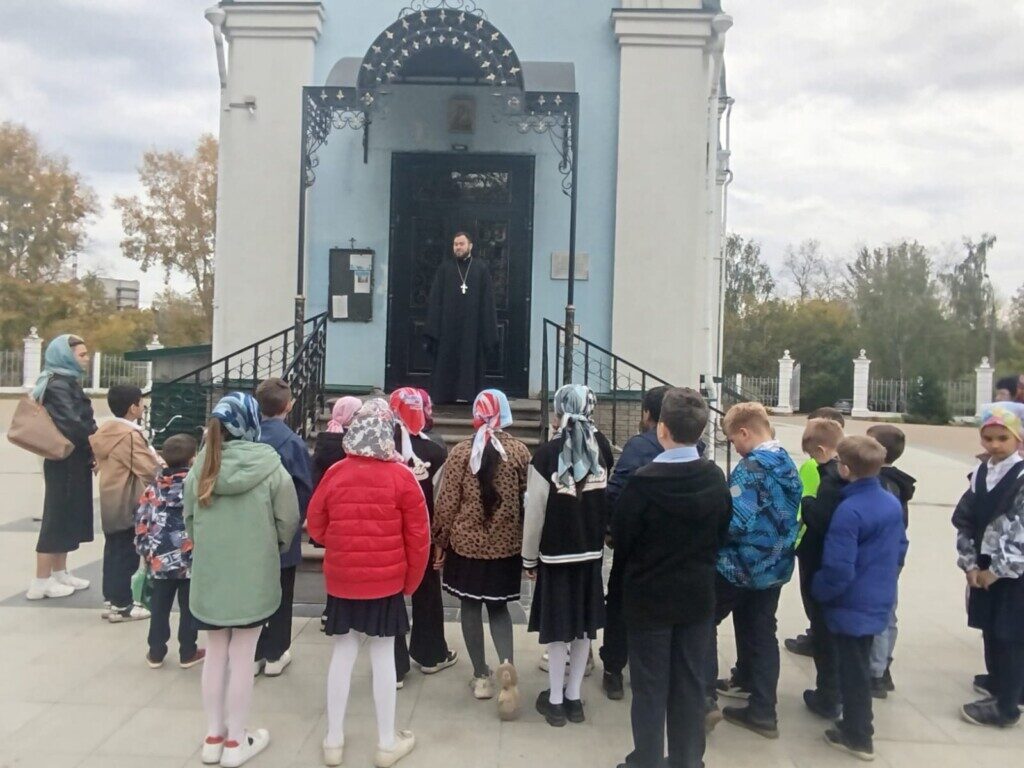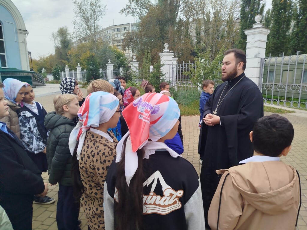 На экскурсии отец Александр рассказал об истории строительства центрального храма благочиния, которому в прошлом году исполнилось 20 лет. Также священник рассказал ученикам, на какие части делится храм, что происходит во время богослужения в каждой из частей, какой символизм имеет количество куполов в храмах. Внутри храма ученикам рассказывали об устройстве иконостаса, истории центрального образа «Скоропослушница». Особенно интересно детям было рассматривать богослужебные сосуды и утварь: отец Александр показал детям потир, дискос, звездицу, лжицу, копие, воздух и покровцы, подробно объяснил, для чего нужен каждый предмет на богослужении. Также священник продемонстрировал устройство кадила и разрешил детям подержать его в руках. Этой возможностью ученики охотно воспользовались.