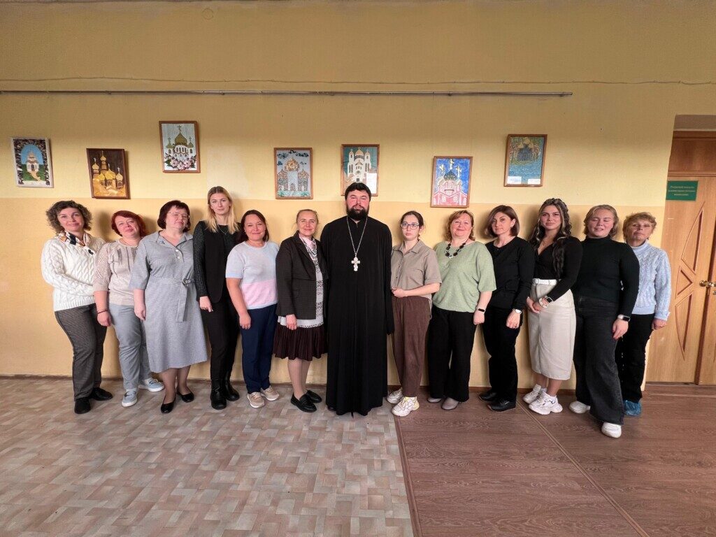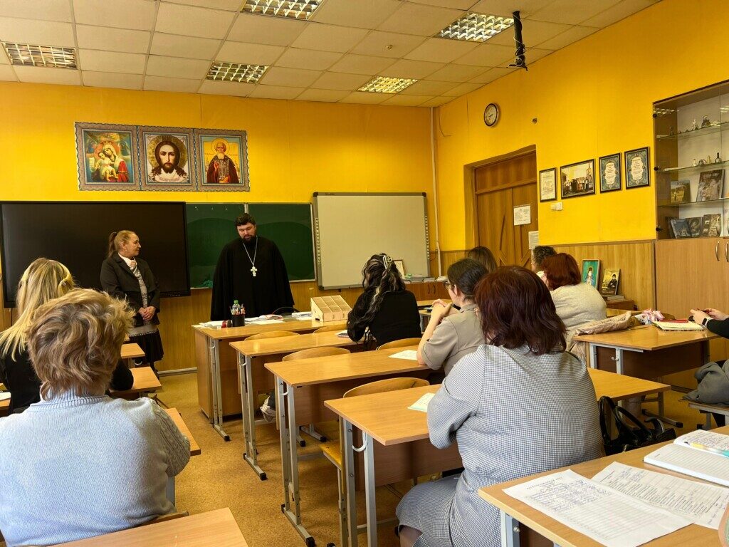 На собрание были приглашены благочинный Московского округа иерей Георгий Мурцхваладзе и куратор благочиния по образованию Большакова Екатерина. Отец Георгий поздравил учителей с началом учебного года, пожелал активную и деятельную поддержку со стороны благочиния каждому, выразил надежду, что интерес в дружбе и соработничестве окажется взаимным. Куратор благочиния обсудила с педагогами возможность посещения храмов благочиния с экскурсиями для учеников 4-ых классов, участие школьников в епархиальных и благочиннических конкурсах.