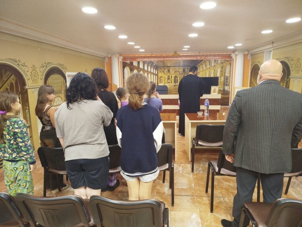 Во взрослой больнице отец Александр совершил молебен в отделении хирургии, где находятся на лечении маломобильные и немобильные пациенты. На молебне он поименно помянул тех, кто находится на лечении в хирургии. После молебна священник также прошел по палатам и окропил больных.